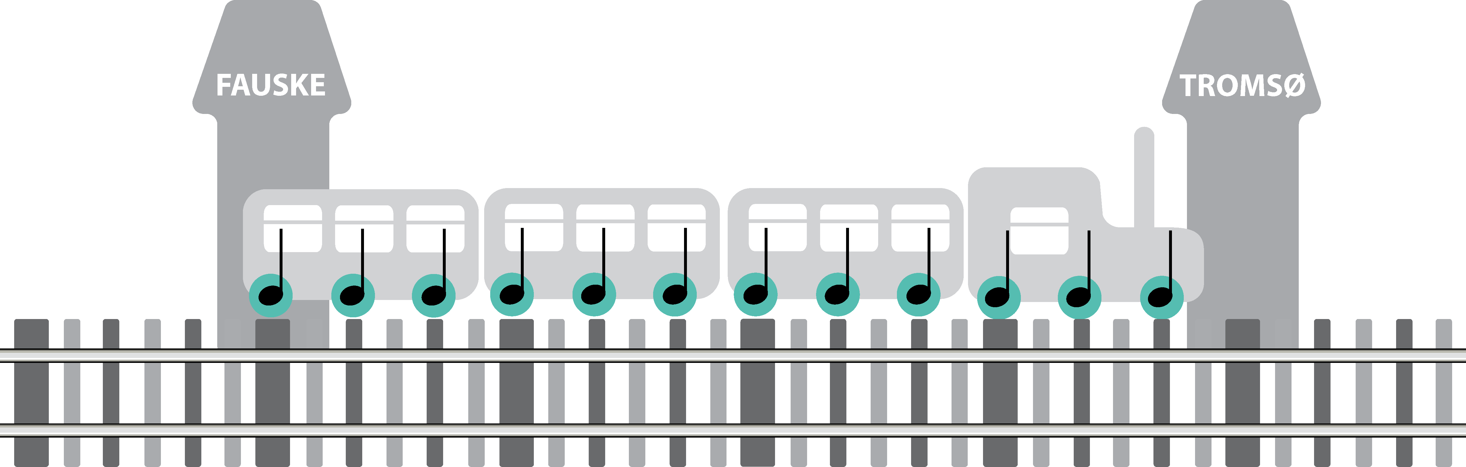 Rytme foregår i tid og vises horisontalt i notebildet. I likhet med toget har rytmen en pulserende fremdrift og bevegelse. Rytmen kan deles inn i ulike lag, fra mikro til makro: Underdelinger (svillene), pulsen (hjulene), taktart (vogn) og frase (stasjoner). Hver takt er en ligning som skal gå opp, og i notenes utseende ligger all den informasjonen som skal til for å skjønne hvordan komponentene er skrudd sammen.